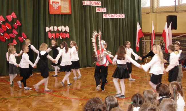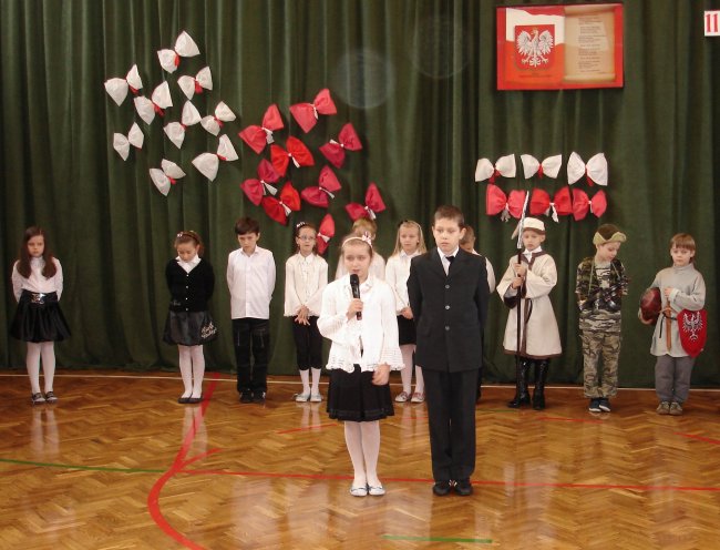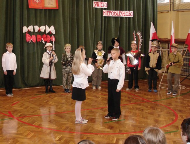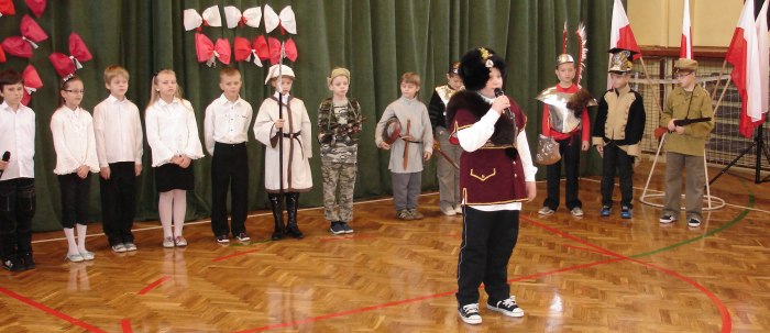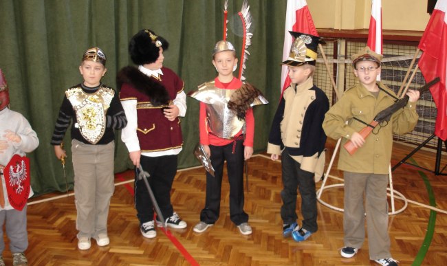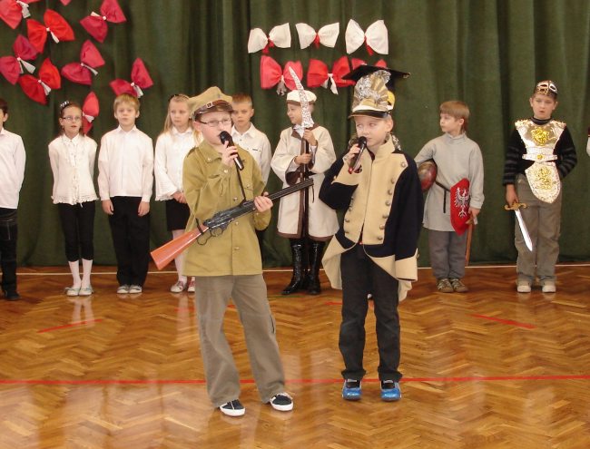 Bardzo ciekawą inscenizację wspomagał chór szkolny pod kierunkiem p. Arkadiusza Kluby. Wysłuchaliśmy z ogromnym zaciekawieniem krótkiej historii walk Polaków o niepodległość oraz patriotycznych pieśni. Tradycyjnie uroczystość zakończyła się polonezem w wykonaniu koła tanecznego, którego opiekunem jest p. M. Stępień. Całe to wzruszające i przesiąknięte ogromnym patriotyzmem przedstawienie wszystkim nam się bardzo podobało.