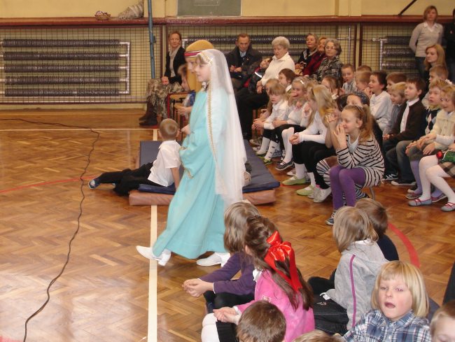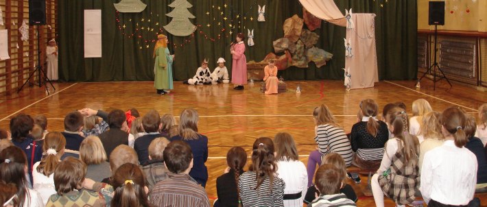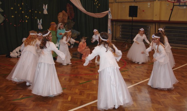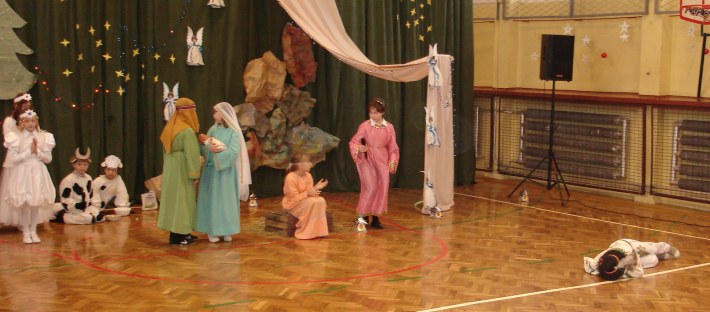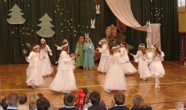 Przed przedstawieniem Dyrektor szkoły p. mgr Beata Bzdon serdecznie wszystkich powitała i złożyła życzenia świąteczne. I zaraz potem młodzi aktorzy przenieśli nas w czasie do Ziemi Świętej, do wydarzeń związanych z narodzeniem Jezusa Chrystusa. Występ był wzruszający - pełen pięknej muzyki, tańca i śpiewu oraz kolorowych postaci. Wszystko to odbywało się w przepięknej i pełnej symboli scenografi przygotowanej przez s. Krystynę Żebrowską.