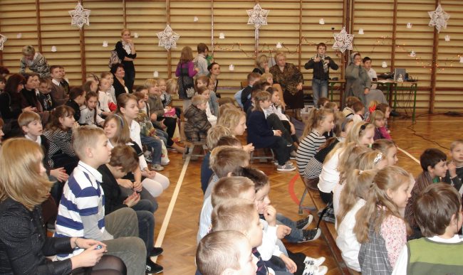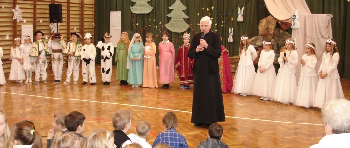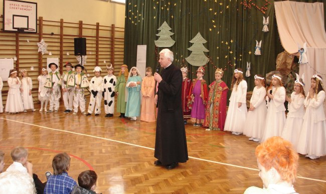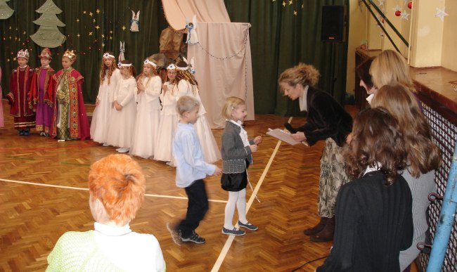 Po występach uczniów Dyrektor Szkoły p. Beata Bzdon wręczała nagrody uczniom i klasom za zajęcie pierwszych miejsc w konkursach na najładniej świątecznie przystrojoną salę lekcyjną oraz najładniejszy stroik świąteczny. A na koniec wszystkim zgromadzonym złożył życzenia i podziękował za tak piękną uroczystość nasz specjalny gość - ksiądz Jan Sambor - proboszcz miejscowej parafii pw. św. Judy Tadeusza.