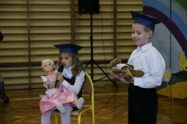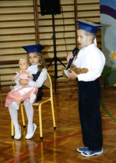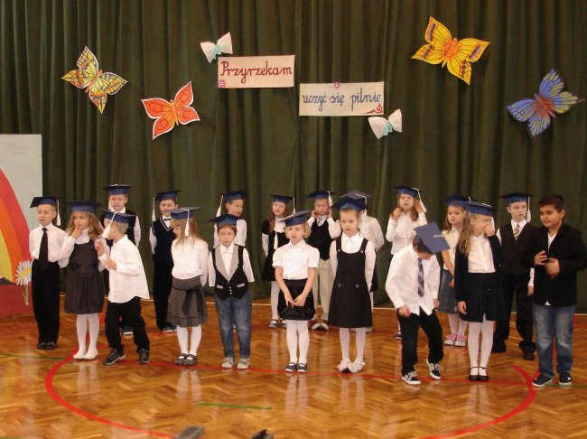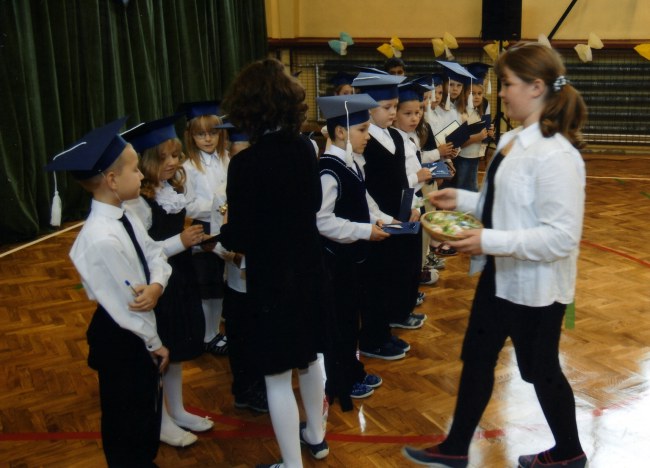 Uczniowie pierwszej klasy zaprezentowali bardzo ciekawy program artystyczny przygotowany pod kierunkiem wychowawcy klasy p. Iwony Radziejewskiej. A potem zostali powitani w gronie pełnoprawnych uczniów naszej szkoły przez p. Dyrektor oraz przedstawicieli Rady Uczniowskiej, którzy wręczyli im pamiątkowe upominki. Od rodziców otrzymali ogromne "rogi obfitości".
