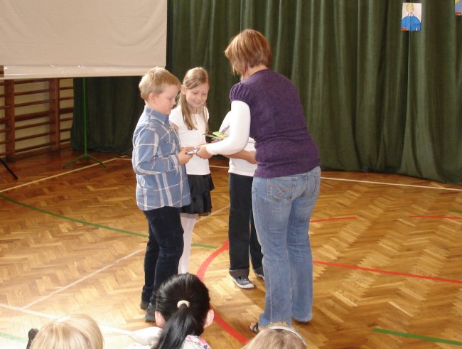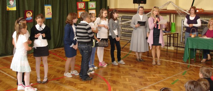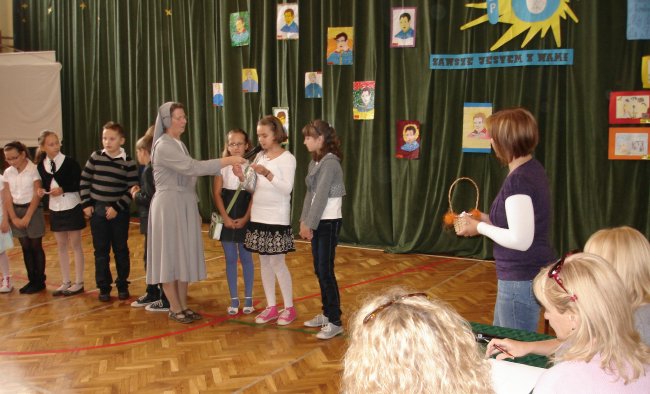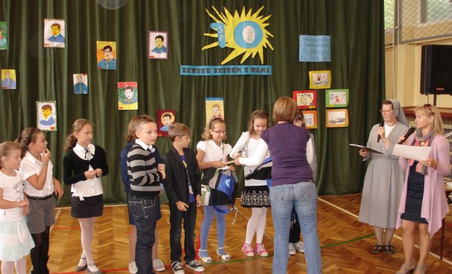 W dalszej części naszej uroczystości odbyło się wręczenie nagród uczniom, którzy zajęli najlepsze miejsca w szkolnym konkursie plastycznym "Św. Stanisław Kostka". Na zakończenie wszyscy mogli obejrzeć prezentację multimedialną o historii naszej szkoły.