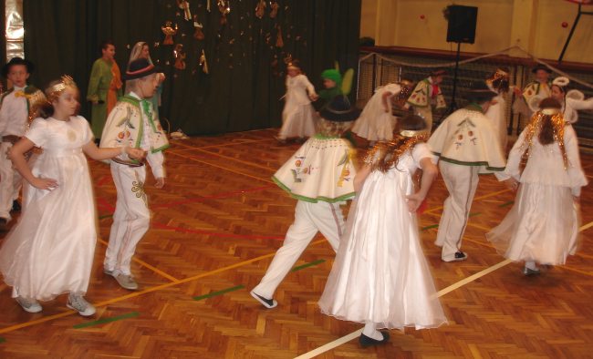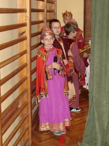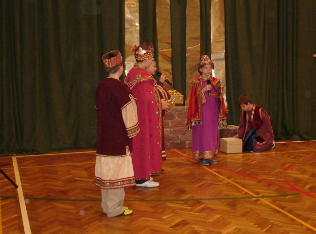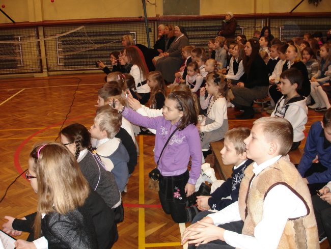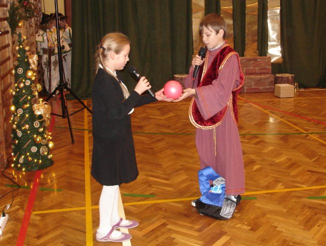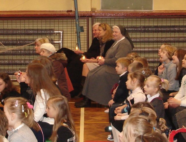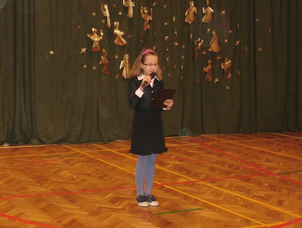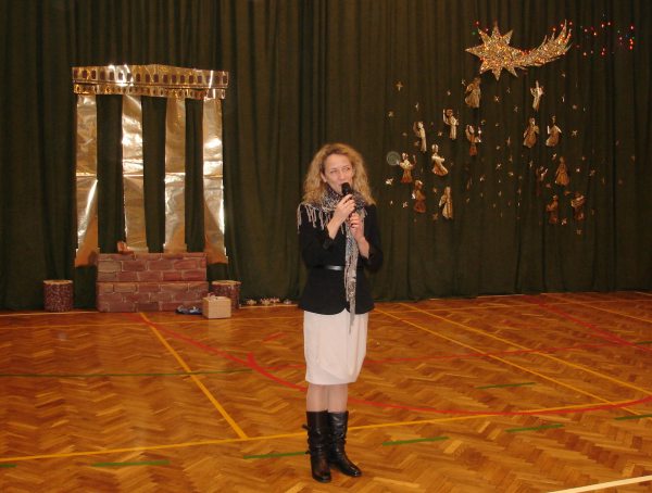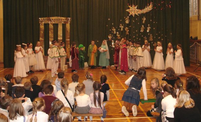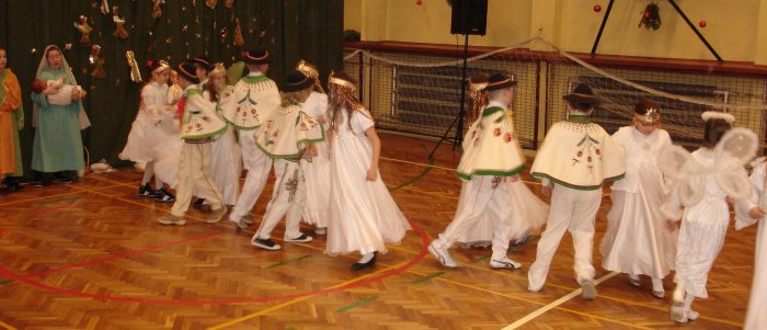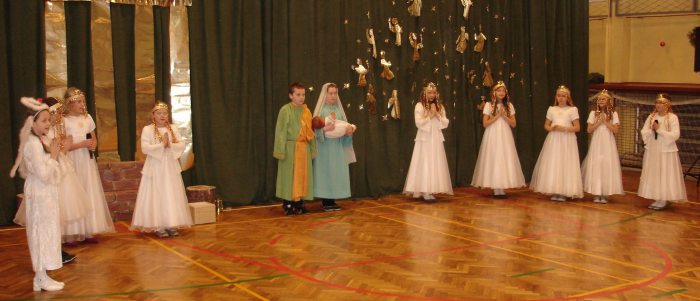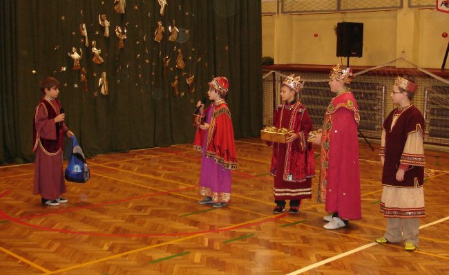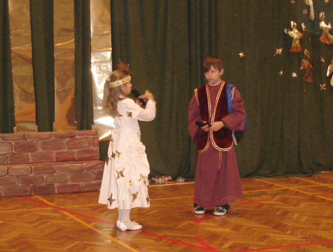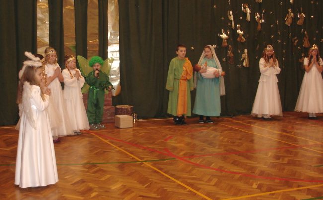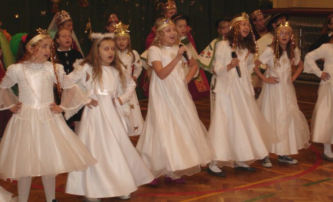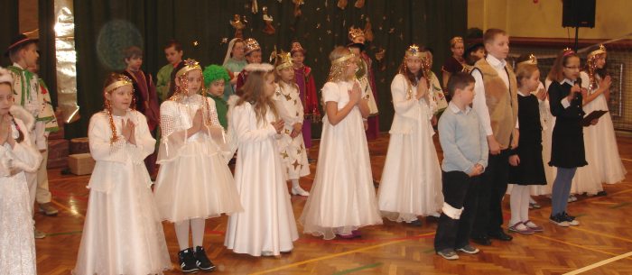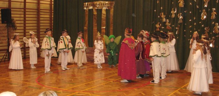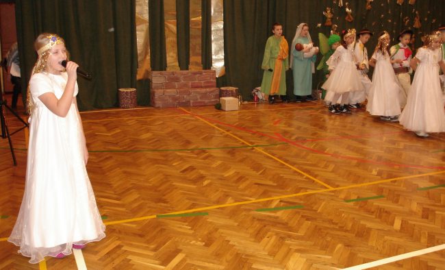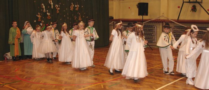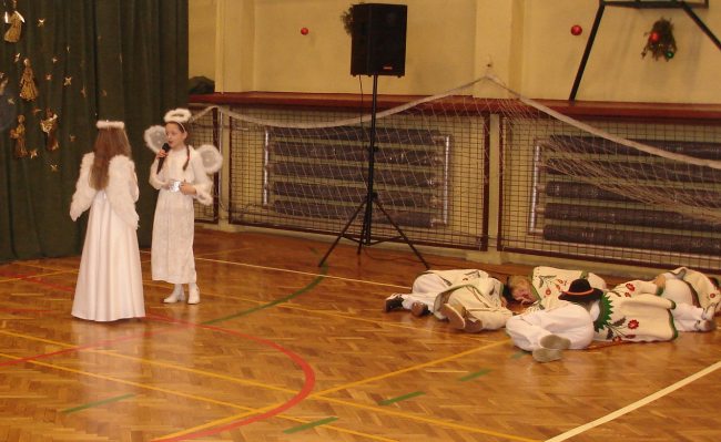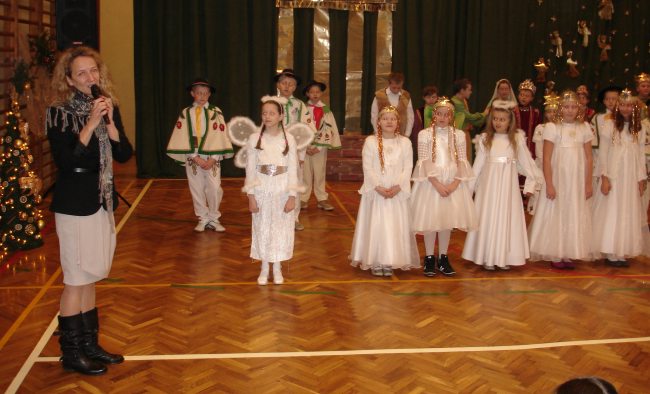 Następnie obejrzeliśmy jasełka przygotowane przez s. Krystynę Żebrowską. Do odświętnie przystrojonej sali gimnastycznej przybyli uczniowie wraz z wychowawcami, rodzice uczniów, emerytowani nauczyciele i honorowy gość - ks. Jan Sambor - proboszcz miejscowej parafii. Uczniowie wystąpili w inscenizacji narodzenia Jezusa Chrystusa. Śpiewali i tańczyli tak wspaniale że zachęcili do wspólnego śpiewania wszystkich zgromadzonych. W przygotowaniu przedstawienia pomogli s. Krystynie m.in.: rodzice uczniów, p. M. Ujma (scenografia) oraz p. Małgorzata Stępień - emerytowana nauczycielka (układ taneczny).