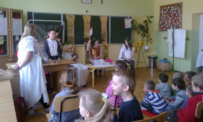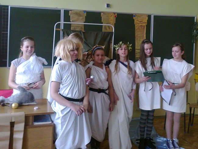 Przygotowali historię króla Syzyfa oraz spór bogiń o złote jabłko. Należy dodać, że nasi uczniowie nie tylko ciekawie odegrali role, ale sami byli twórcami scenariusza, kostiumów i dekoracji. Występy młodych aktorów oceniała niezwykle miła, acz wymagająca publiczność z oddziałów przedszkolnych. Nasi milusińscy przyrzekli, że za kilka lat sami przygotują takie przedstawienie. Trzymamy ich za słowo!